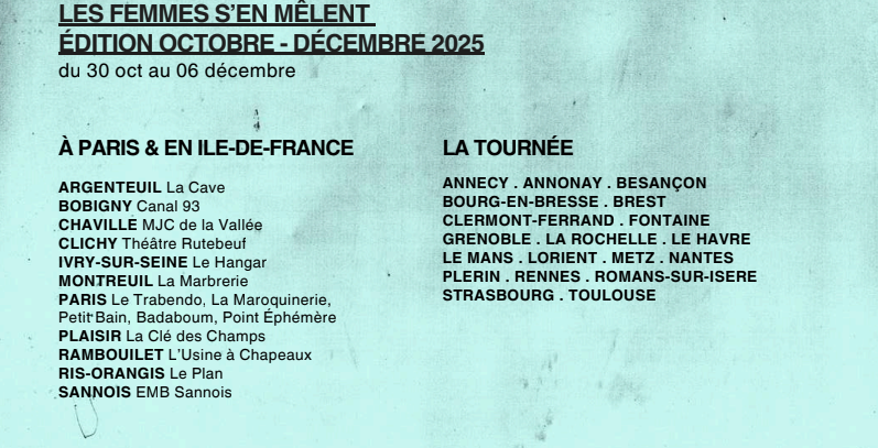 D’ores et déjà cet événement a débuté en province le 30 octobre 2025 et débutera le 08 novembre à Paris et Ile-de-France, chacune et chacun pourront partager cet instant fort de la scène musicale française et internationale avec une programmation exceptionnelle rassemblant 60 artistes engagées et inspirantes au devant desquelles vous pourrez partir à leur rencontre, les découvrir, les encourager, leur reconnaître tout le talent qu’elles possèdent et les soutenir telle est une des finalités de ce bel événement.