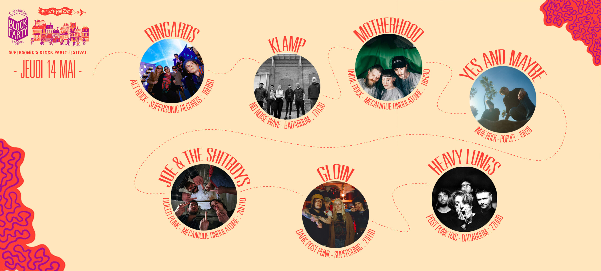 Le jeudi 14 mai est marqué par le passage de Heavy Lungs et Joe & The Shitboys qui seront probablement très attendus ! Pour notre part, on attaquera avec Ringards et leur alt rock pour enchainer avec Klämp dont l’un des membres est aussi dans IDLES. Avec ces deux pointures, on sait que la journée débutera fort, mais il sera difficile pour nous de choisir entre Sandhouse, duo de dreamrock londonien et les américains de Motherhood pour continuer notre journée… Ce qui est certain par contre, c’est que l’on enchaînera par Yes And Maybe, Joe & The Shitboys, Gloin (même si Soft nous fait de l’œil aussi) et enfin Heavy Lungs pour terminer ! Une première journée bien remplie et mouvementée, attendez de voir la deuxième !