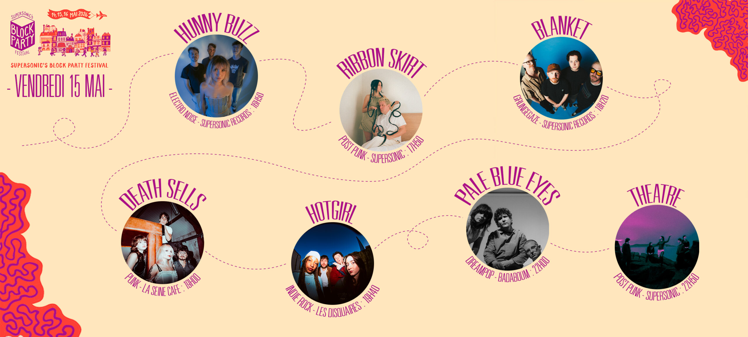 70 groupes de la scène internationale, 3 jours de pur rock indé pour secouer le quartier de la Bastille, la Supersonic’s Block Party est l’un des événements à ne pas rater ce printemps sur la capitale ! Les 14, 15 et 16 mai, c’est pas moins de 10 salles qui sont investies pour accueillir l’immense vague de groupes mais pas que, on retrouve aussi du tattoo, du marché créateur, un cinéma, le tout au cœur du quartier le plus rock de Paris ! Histoire de vous teaser un peu -et parce qu’on y sera- on vous propose de se pencher un peu sur la programmation et de vous dévoiler notre emploi du temps !